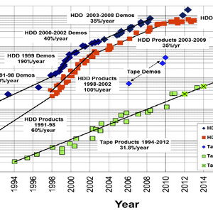 具体的には富士フイルムが 2012 年に初めて磁気テープに適用したバリウムフェライト(BaFe)という磁性体になります.この変更により,次のように停滞するトレンドにあった容量増加のペースが再度加速しました.