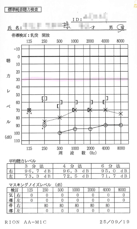 一般的な聴力レベルと照らし合わせると、右耳は重度難聴、左耳も高度難聴という判定で、障害者手帳の対象となるレベルでした。
