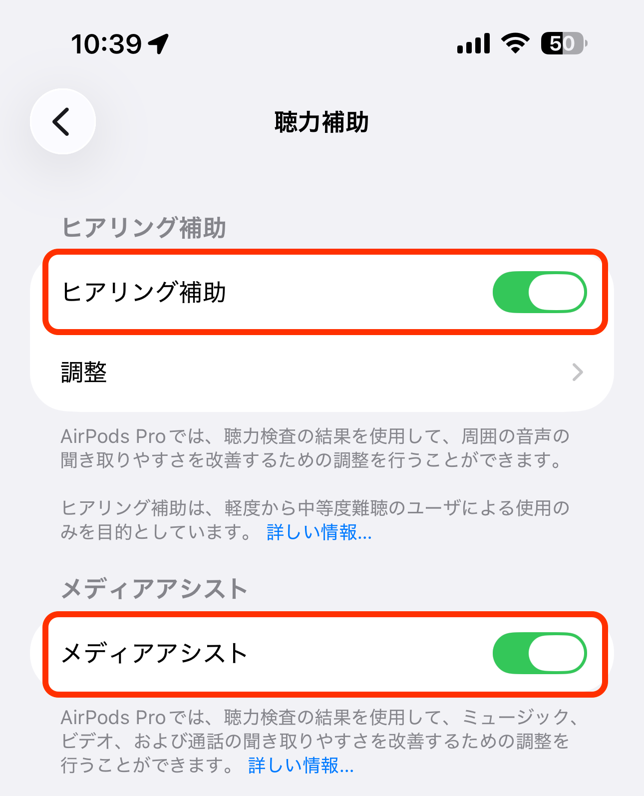 チェックが完了したら、下記のように聴力補助機能を有効化します。